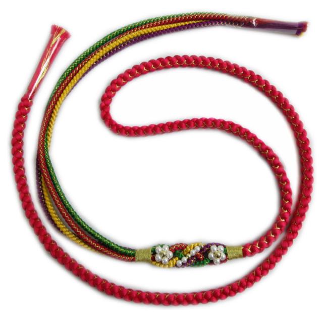 帯締め 帯〆 パール花飾り付 正絹 赤色金 振袖 成人式 着物 先割れ 4色使い 振袖用 きもの