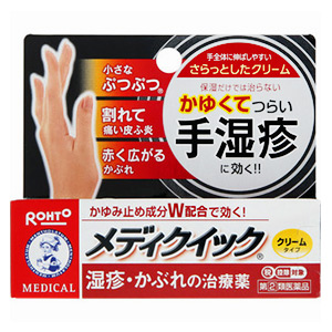 | 商品特徴 | かゆみや小さなぷつぷつ(水ぶくれ)など、手湿疹のつらい症状に効く治療薬です。高い消炎効果のプレドニゾロン吉草酸エステル酢酸エステル(アンテドラッグステロイド)を配合し、患部で優れた効き目を発揮し、体内に吸収されると低活性になります。また、傷ついた肌を修復するアラントイン他4種の有効成分が効果を発揮します。手のひらなどの広い患部にもよくのびてベタつかず、患部にしみにくい低刺激性タイプのクリームです。医薬品。 治療のコツ ●こまめにぬる 特に薬が落ちやすい部位(手・腕など)には一日数回塗り直すと効果的です。 ●就寝時にじっくり 患部を休めることができ、薬もとれにくいから、おやすみ前のご使用は有効です。 ・症状が改善するにともない、メディクイックの使用回数を適時減らしていきましょう。また、手湿疹症状の再発を防ぐためには、しっかり保湿ケアを心がけることが大切です。 ・症状が治りにくい時、また、慢性的に症状をぶりかえす方は、医師に相談されることをおすすめします。 |