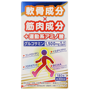 | 特徴 | 軟骨成分(プロテオグリカン・コンドロイチン)に筋肉成分(イミダペプチド)を加え、運動系アミノ酸(BCAA)をプラスした、バランス栄養補助食品です。 さらに関節痛対策成分として、利用者の体感効果が・b「といわれるグルコサミンを改善データである1500mg配合しています。 |