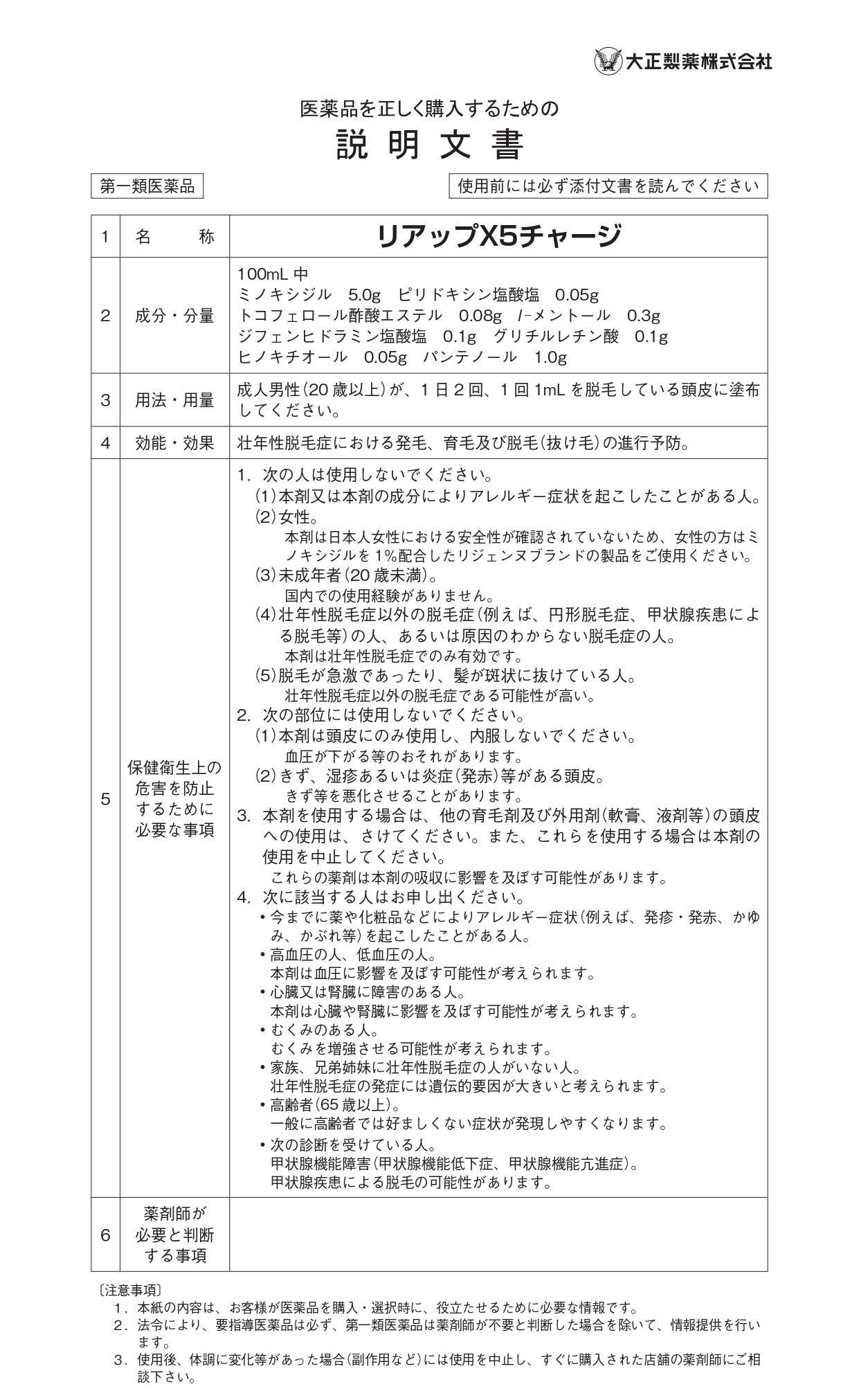 ●リアップX5チャージは、一般用医薬品において日本で唯一の発毛成分ミノキシジルを国内最大濃度※5%配合した男性用の発毛剤です。
