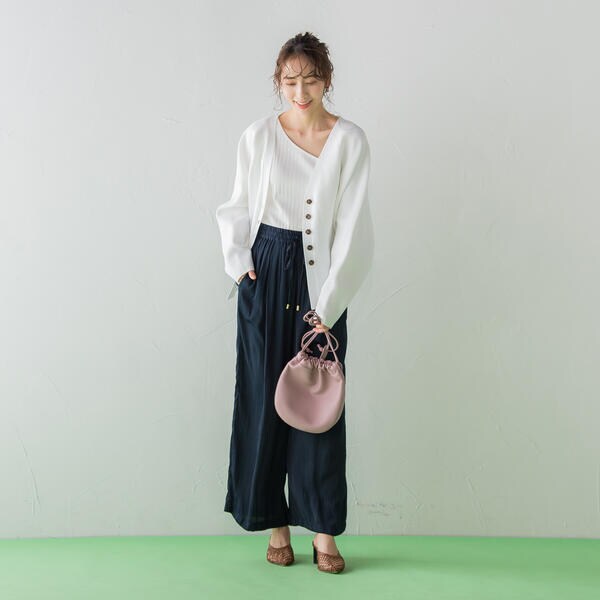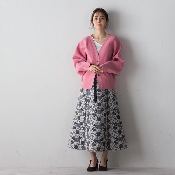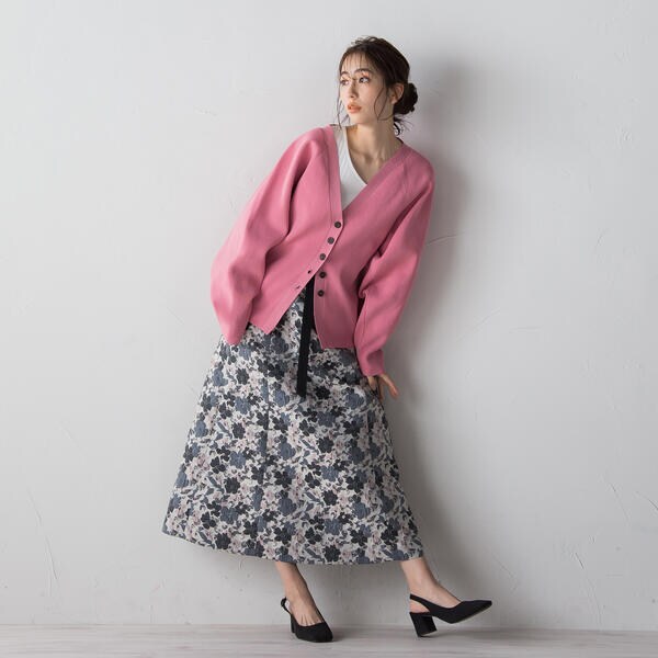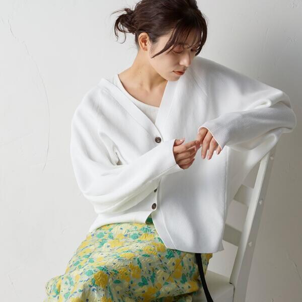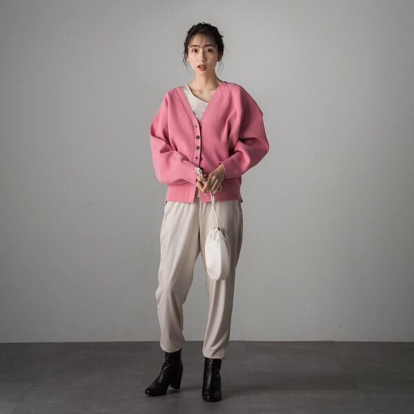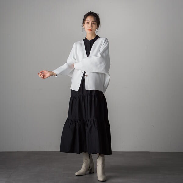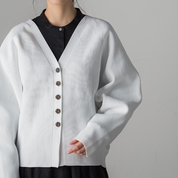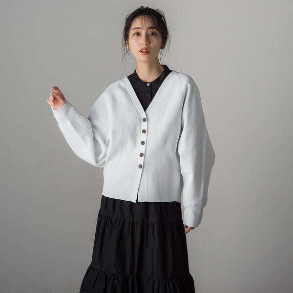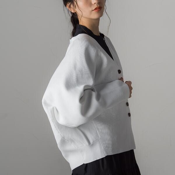 少しのモード感がありつつ柔らかなシルエットを演出してくれるニットカーデ。