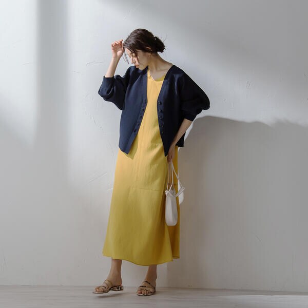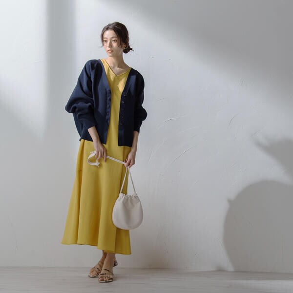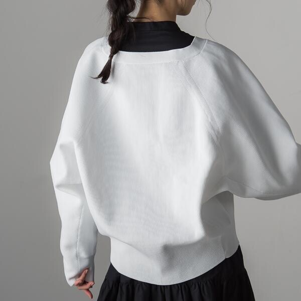 中が空洞になった膨らみのある糸で、ゆったりとしたフォルムでも軽さが特徴の素材。