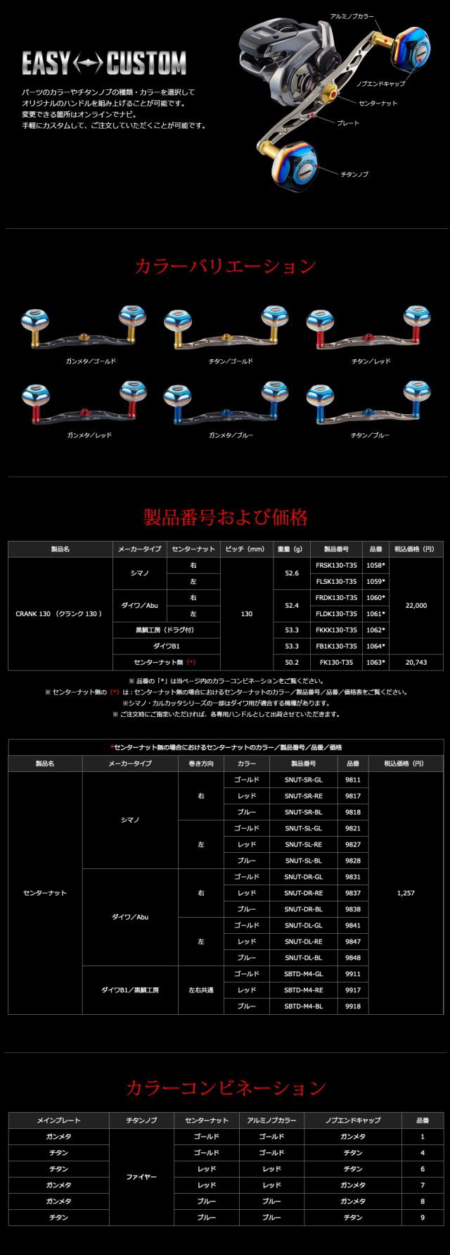 パーツのカラーやチタンノブの種類・カラーを選択してオリジナルのハンドルを組み上げることが可能です。