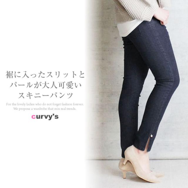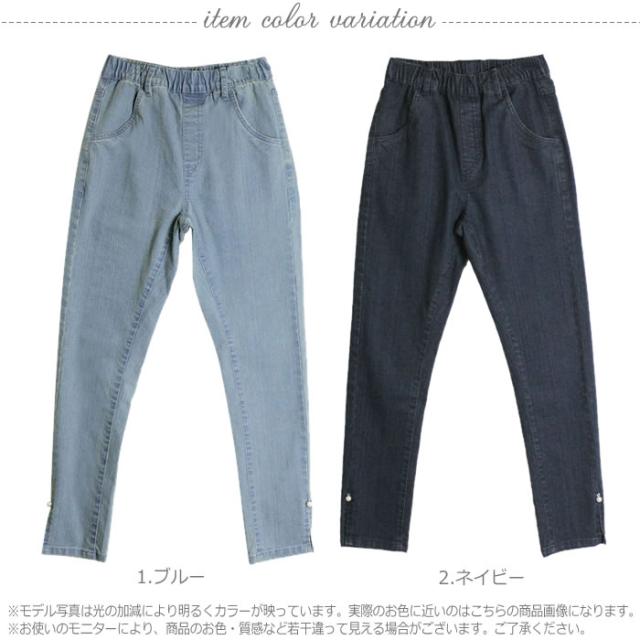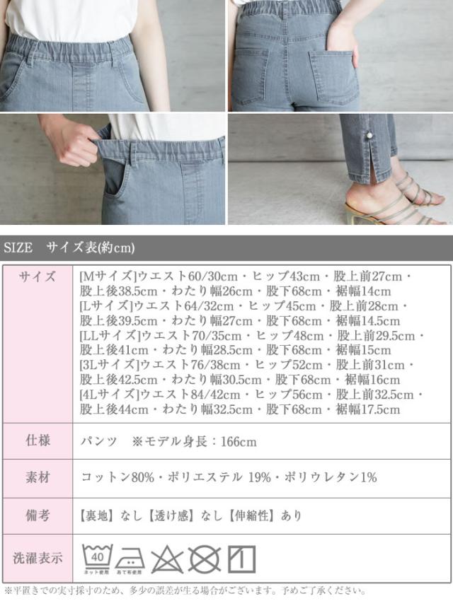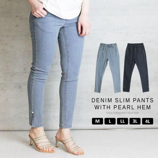 デニム パンツ 宅配便配送 スキニーパンツ 裾 スリット パール カジュアル おしゃれ かわいい 大人 5営業日以内入荷 大きいサイズ レディース M L LL 3L 4LLARU ラルー 裾パール付きウエストゴムデニムスリムパンツ