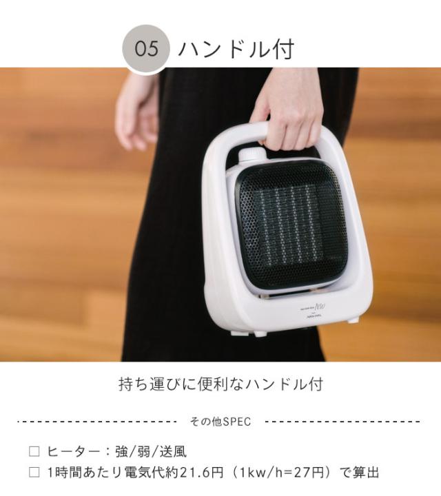 | ◇ ヒーター:PTCヒーター ◇ 風量:強/弱/送風 ◇ 転倒OFFスイッチ ◇ 角度調節 ◇ 1時間あたり電気代約21.6円(1kw/h=27円)で算出 |