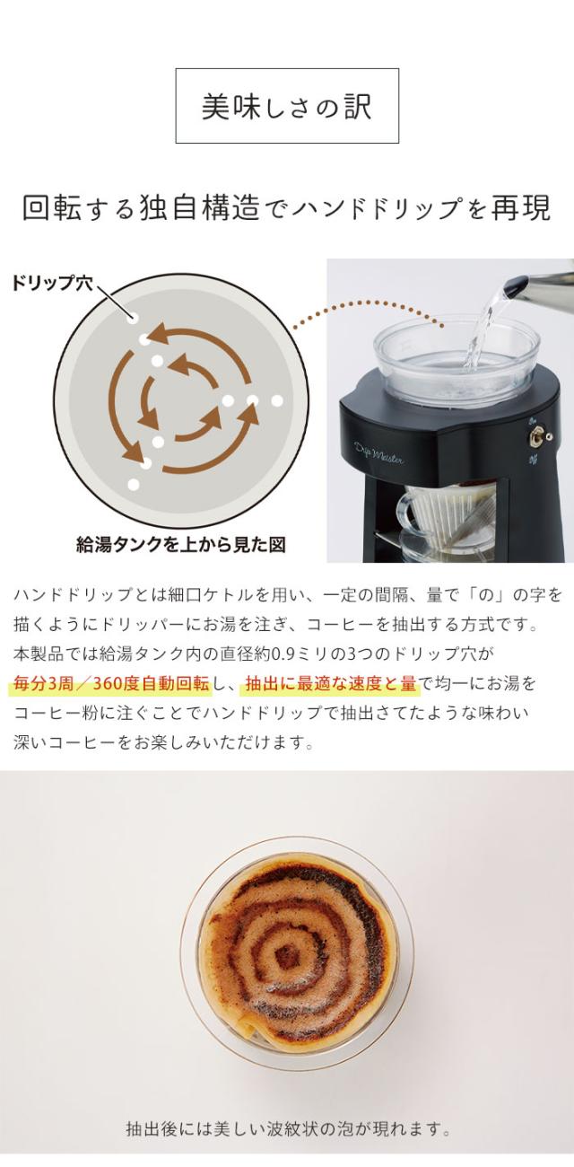 | ハンドドリップの厳しい温度管理や抽出速度、抽出理論を研究したコーヒーメーカー。 給湯タンク内の直径0.9ミリの3つのドリップ穴が毎分3周/360度回転し、一定の速度でお湯をコーヒー粉にそそぎます。 二重構造の給湯タンクにする事で抽出に適した温度を保ち、約4〜4分30秒かけてドリップをします。 サーバーにダブルウォールガラスを採用することで、保温性が高く、コーヒーの温度と香りを逃しません。 乾電池で動くコードレス仕様でどこにでも持ち運び可能。 |