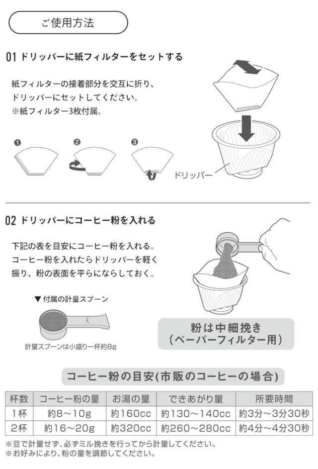 | 計量スプーン、紙フィルター(3枚)、クリップ |