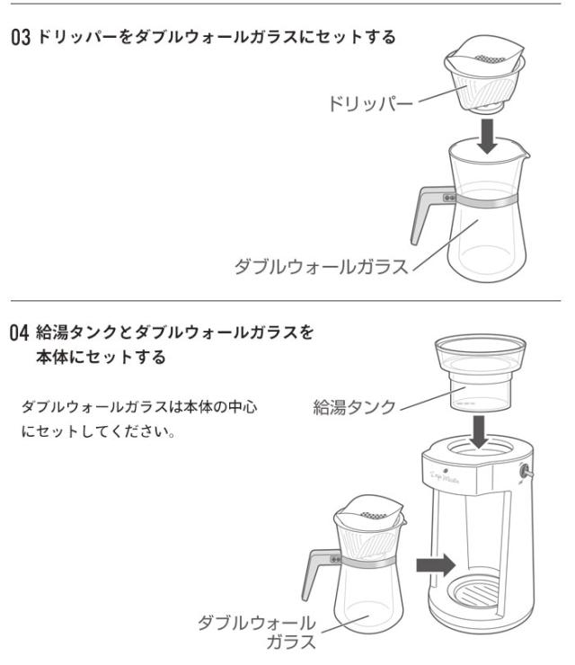 | [本体]ABS [底部]PP [給湯タンク蓋]PP [ドリッパー]ポリエステル [ダブルウォールガラス]ガラス [ハンドル部]PP |