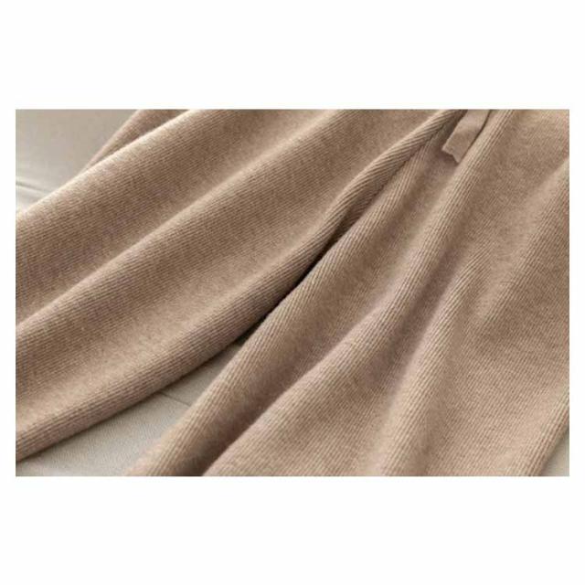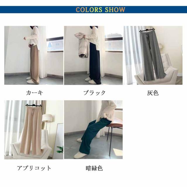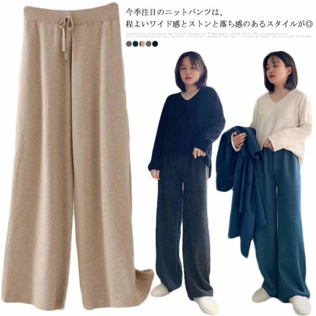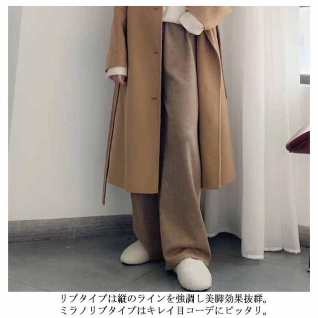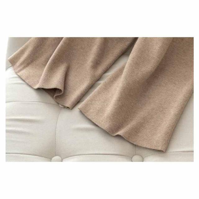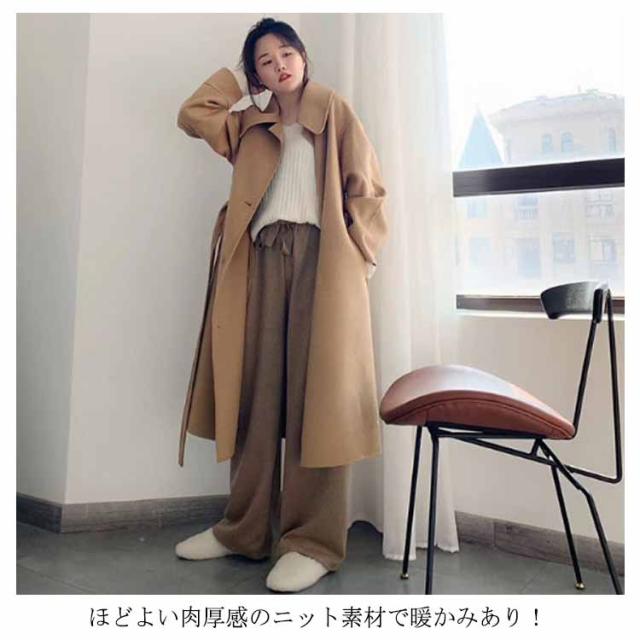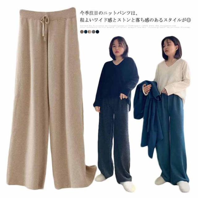リブニット レディース ウエストゴム ニット ブラック ロングパンツ ワイドパンツ ニット リブ 送料無料 リラックス ガウチョ フレアパンツ ゆるパンツ ゆるパンツ リラックス 秋冬 春 秋 ニットパンツ