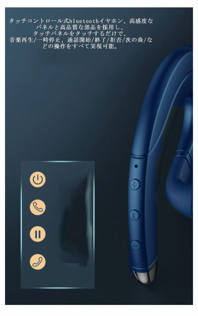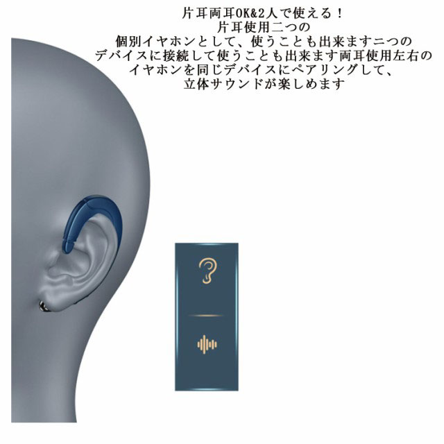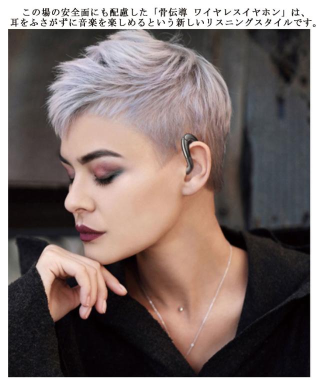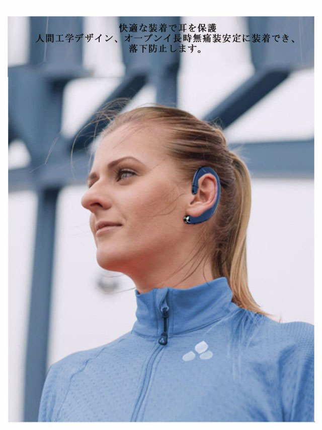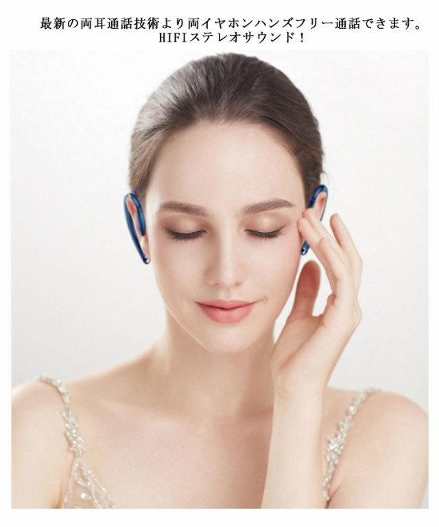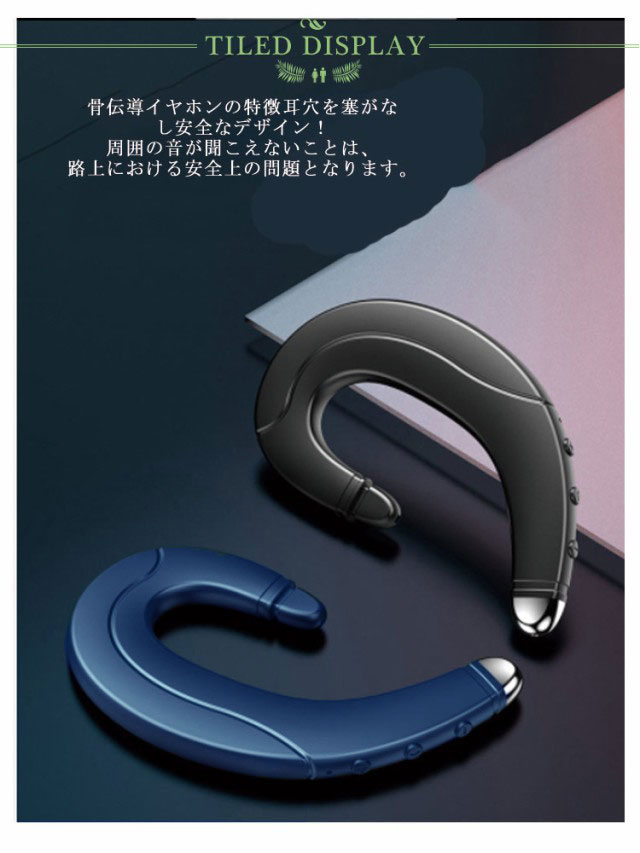 | 耳を塞がない・骨伝導・耳を解放する! 骨伝導イヤホンの特徴耳穴を塞がなし安全なデザイン! 周囲の音が聞こえないことは、路上における安全上の問題となります。 この場の安全面にも配慮した「骨伝導 ワイヤレスイヤホン」は、耳をふさがずに音楽を楽しめるという新しいリスニングスタイルです。 最新の両耳通話技術より両イヤホンハンズフリー通話できます。 HIFIステレオサウンド! 最先端の無線通信技術と最新知能チップを採用しており、従来バージョンより更に高速データ伝送でき、音の途切れ、音割れ、遅延などの問題を改善し、接続安定性を高めます。 タッチコントロール式bluetoothイヤホン、高感度なパネルと高品質な部品を採用し、タッチパネルをタッチするだけで、音楽再生/一時停止、通話開始/終了/拒否/次の曲/などの操作をすべて実現可能。 従来より省電カ、低遅延と安定した接続を実現 自動ペアリング機能が付きます、簡単接続可能です! または、2度目以降の使用は、ケースからイヤホンを取り出すだけで自動的にペアリング設定済みのデバイスと再接続できます。 快適な装着で耳を保護 人間工学デザイン、オ一プンイ長時無痛装安定に装着でき、落下防止します。 片耳両耳OK&2人で使える! 片耳使用二つの個別イヤホンとして、使うことも出来ますニつのデバイスに接続して使うことも出来ます両耳使用左右のイヤホンを同じデバイスにぺアリングして、立体サウンドが楽しめます 防水仕様! ランニング中の突然の雨などの水も防ぐことができ天候やシ一ンを選ばず音楽を楽しめます。 ◆使用方法 ・Bluetooth接続方法 イヤホン・ケース充電後、イヤホンを取り出していただくとBluetooth接続可能状態になります。 接続したいデバイスでBluetoothを検索し接続頂ければ使用可能です。 「使い方」 ◆電源のオン/オフ:長押2秒 ◆電話のオン/オフ:1回押す ◆電話を切る:長押2秒 ◆一時停止/再生:音楽の状態を1回押す。 | |