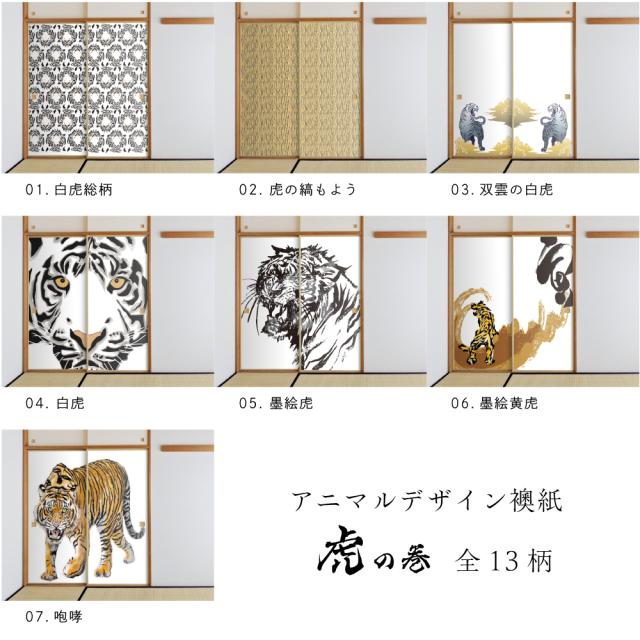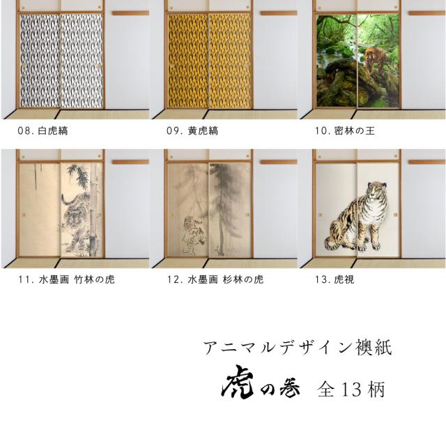 13柄)Tiger_01F 白虎総柄、Tiger_02F 虎の縞もよう、Tiger_03F 双雲の白虎、Tiger_04F 白虎、Tiger_05F 墨絵虎、Tiger_06F 墨絵黄虎、Tiger_07F 咆哮、Tiger_08F 白虎縞、Tiger_09F 黄虎、Tiger_10F 密林の王、Tiger_11F 水墨画 竹林の虎、Tiger_12F 水墨画 杉林の虎、Tiger_13F 虎視