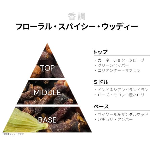 カーネーション、グリーンペッパー、コリアンダー、サフラン、クローブなどが、エキゾチックなスパイシー・ノートを香り立たせるトップから、
