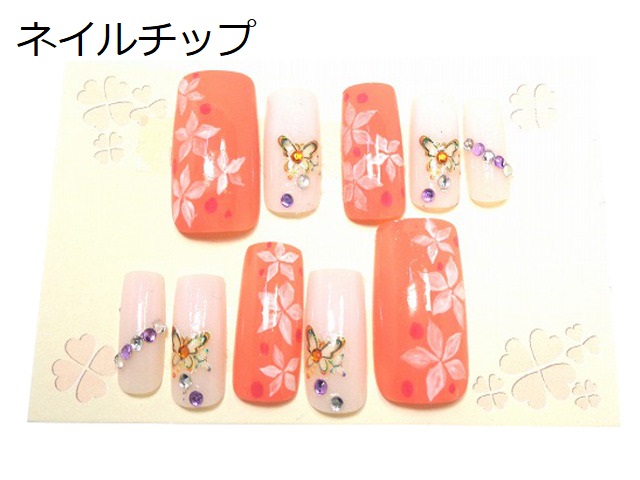 ネイルチップ★硬め仕上げ★付け爪・つけ爪★蝶・花★オレンジ・ピンク★かわいい系★フリーサイズ★ネイルチップ★K