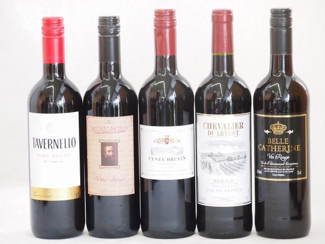 フランス×イタリア赤ワイン5本セット(ミケランジャロ ロッソ(イタリア) タヴェルネッロ ロッソ(イタリア) シュバリエ・デュ・ルヴァン ルージュ(フランス) キャベェブレヴァン ルージュ(フランス) ベル キャサリン ルージュ(フランス)) 750ml×5本