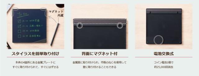 冷蔵庫などの金属面に貼り付けて壁掛けしながら書き込めます。