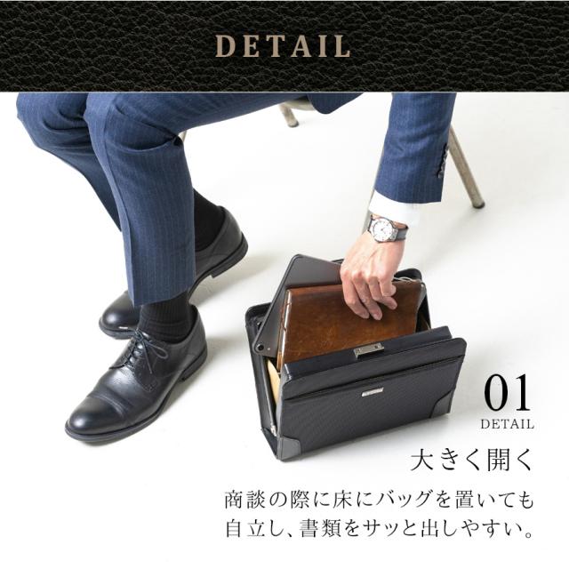 バッグが床に置いても自立し、開口部が大きく開くので、仕事で必要な資料や書類がさっと取り出せ、スムーズな商談ができます。仕切り付きなので、書類も整理して収納OK。