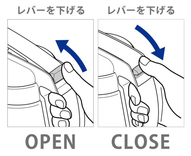開閉レバーは、親指1本で簡単にオープン・注ぐ・ロックの操作ができます。ハンドルのすぐ上にレバーがあるので、手が小さな方にも開閉しやすい設計です。