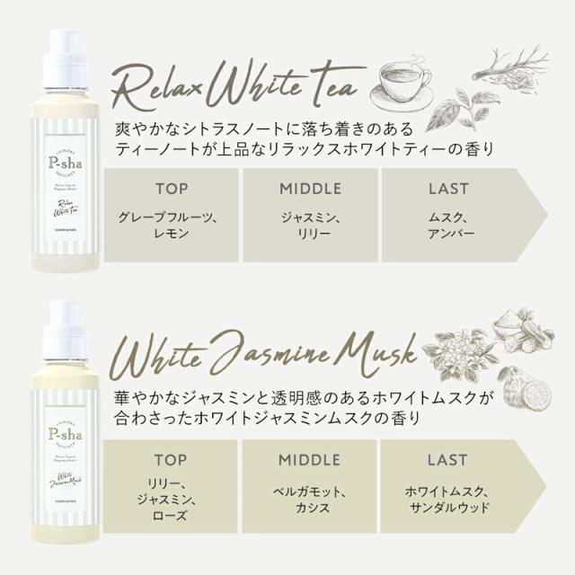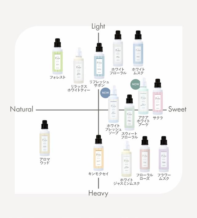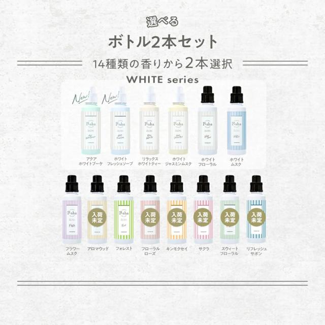 「ホワイトフローラル」「アロマウッド」「フローラルローズ」「ホワイトムスク」「スウィートフローラル」「フラワームスク」「キンモクセイ」「フォレスト」「サクラ」「リフレッシュサボン」「リラックスホワイトティー」「ホワイトジャスミンムスク」「アクアホワイトブーケ」「ホワイトフレッシュソープ」の14種類の香り