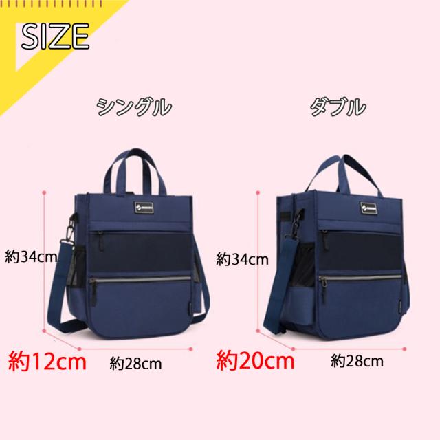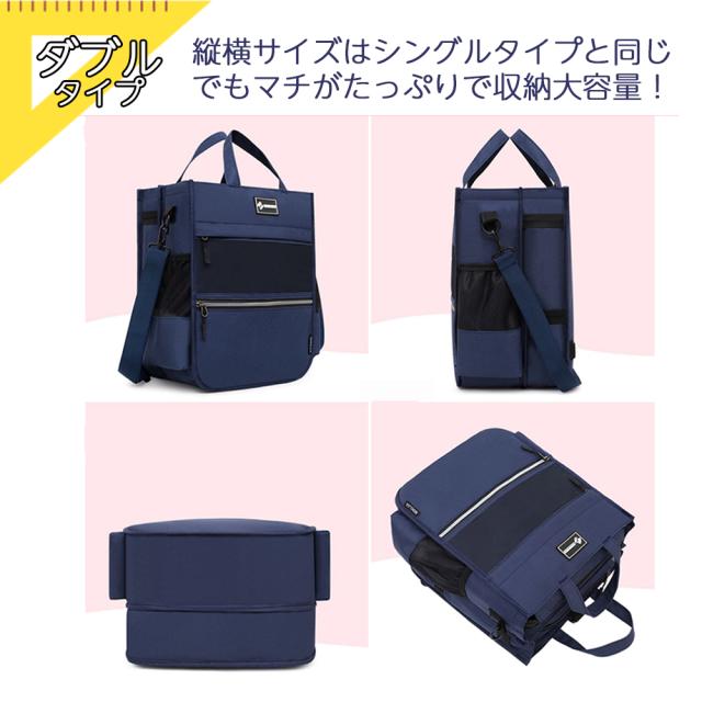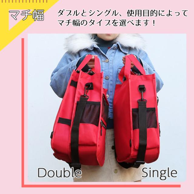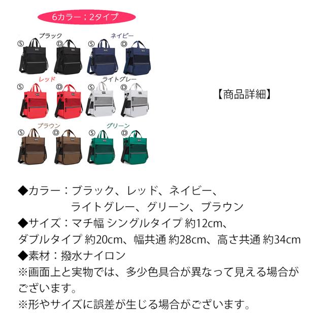 | 主な仕様 | ◆カラー:ブラック、レッド、ネイビー、ライトグレー、グリーン、ブラウン ◆サイズ:マチ幅 シングルタイプ 約12cm、ダブルタイプ 約20cm、 幅共通 約28cm、高さ共通 約34cm ◆素材:撥水ナイロン ※画面上と実物では、多少色具合が異なって見える場合がございます。 ※形やサイズに誤差が生じる場合がございます |
