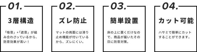 お部屋の隅々に敷いたり、対策したい場所だけに敷いたり、自由自在に防音対策できるのも魅力の一つです。