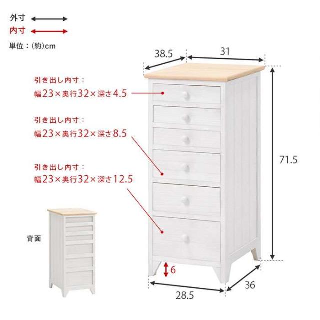 ■商品名:チェスト アンティークホワイト 幅31cm 引き出し6段 高さ71.5cm シャビー アンティーク調 ナチュラル 収納 タンス