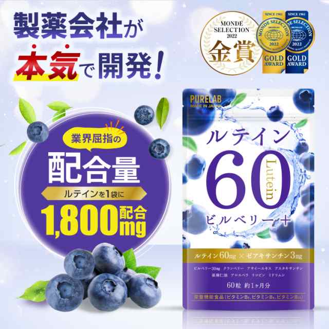 ルテイン60 サプリ ブルーベリー・ビルベリー アサイー サプリメント (製薬会社との共同開発)栄養機能食品ビタミンB2、B6、B12 亜麻仁油 国内製造 1袋 60粒 約30日分 PURELAB 送料無料 ギフト プレゼント