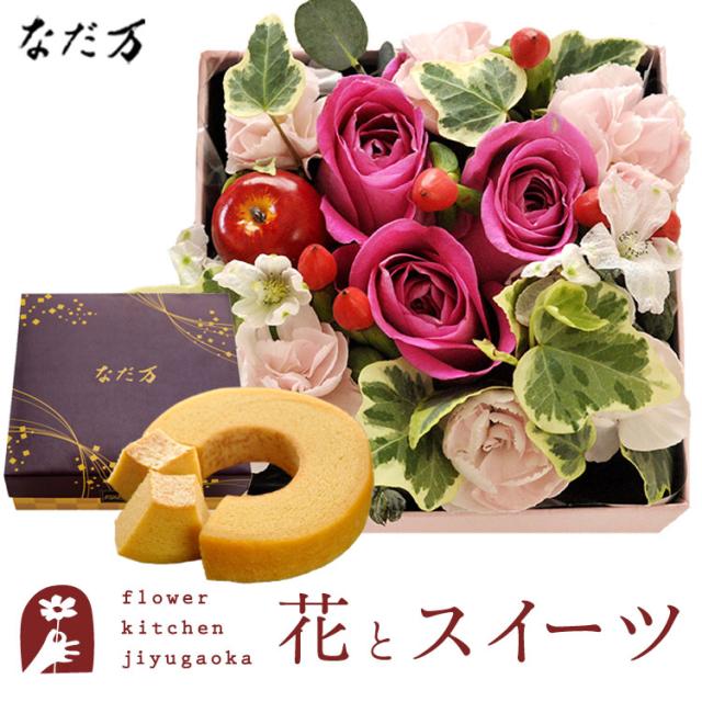 花とスイーツのセット 四角フラワーボックスMサイズアレンジ+なだ万監修 和三盆バウムクーヘン プレゼント 誕生日 記念日 お祝い花 即日発送 あすつく メッセージカード FKAASW
