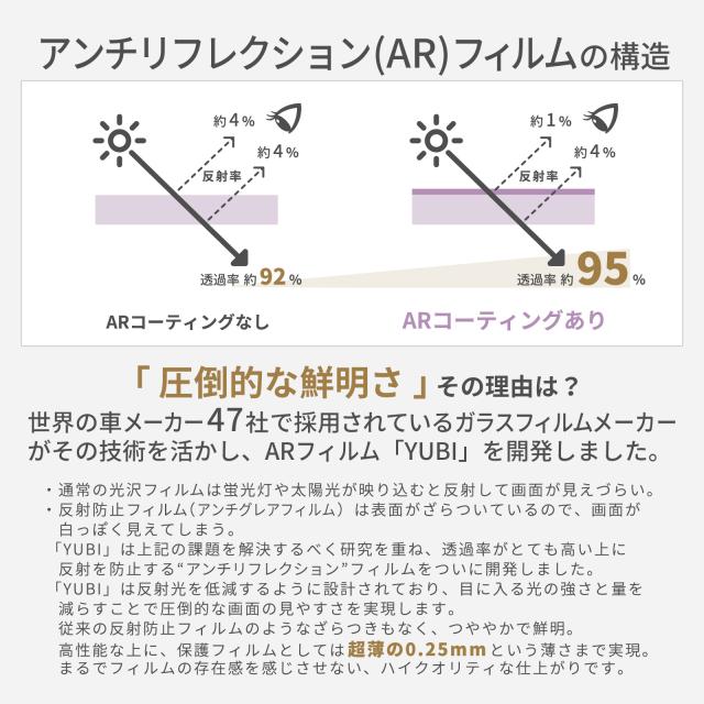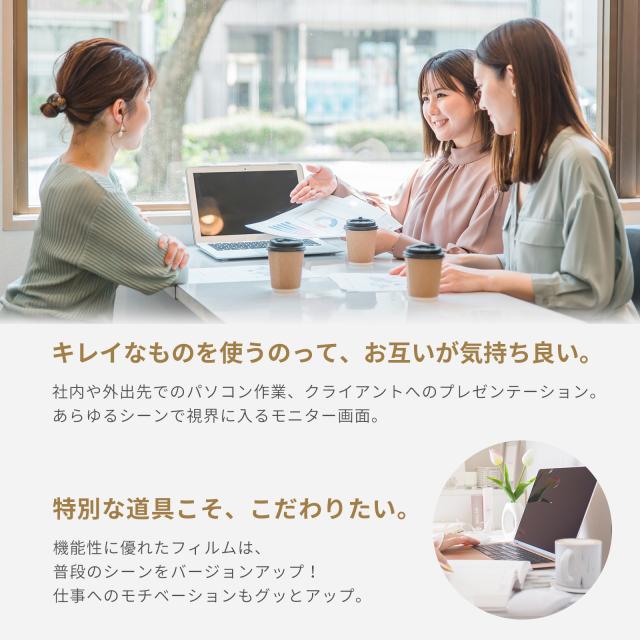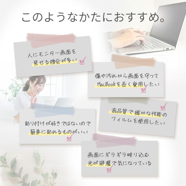 | ・アンチリフレクション(AR)とは ノートPCやタブレットPCのディスプレイに 光灯や外の光が映りむと 画面の内容が見えにくくなります。 ARタイプフィルムはベースフィルムの上に異なる屈折率を 持つフィルムが重なっています。 その反射する光を抑制することで、視認性を向上します。 つまり見えやすくするためのフィルムがAnti-Reflectionです。 ・高透過率95%で貼っても画面の色が変わりにくい。 ・変色しにくい素材を使用 ・圧倒的透明感のプロクオリティ ・イラストレーターやプロのデザイナーの方にオススメ ・まるでフィルムを貼っていないような仕上がり ・通常の光沢フィルムより硬度高いので傷がつきにくい ・画面保護や紫外線ブロックに ・従来の液晶シートや表面のアンチグレア処理は、 "光の反射を無くす"のではなく"乱反射"させて光を拡散させているので、 黒が白っぽくなるなど色自体の再現率が低くなる現象がありました。 それを改善するために、光を積極的に取り入れる新処方を採用。 ・ 色のにじみを抑制して再現率をアップし人間の目に自然な美しい艶を与えています。 ・表面の傷修復特殊コートにより細かい擦り傷が時間と共に薄れます。 ・耐指紋コーティングにより汚れもクロスですぐに拭き取れます。 ・MacBook液晶画面の端までピッタリとフィット。気になる部分を安全保護。 ・ガラスフィルムで感じていた段差と厚みをなくし本体との一体感をUP。 ・側面から見ても、ほとんど分からない極薄感。 ・保護ケースにも干渉しません。 ・指紋・ホコリの付着を抑え、より傷がつきにくい耐久性を実現しました。 ・吸着性UPで剥がれ落ちない。 ・優れた全面吸着技術により持ち運び時のフィルム剥がれを防止。 ・高品質!100%日本素材 海外工場で加工をすることでコストダウンし、 低価格ながらも高性能な製品を実現しました。 | |||||||||||||||