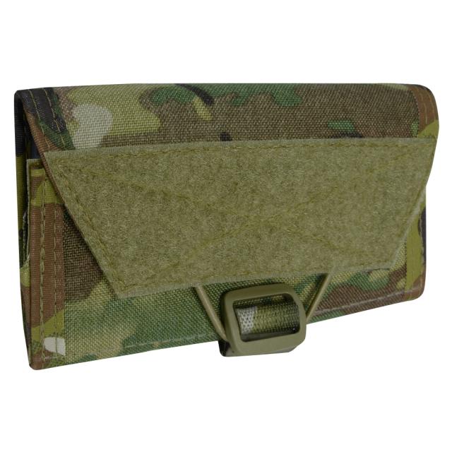 スマートフォンやメモ帳、マップ、ペン類などの携行に便利な、3つ折り式の薄型ポーチ。内部にベルクロ着脱式のスマホホルダーを備え、本製品をプレキャリの胸部に取り付けておけば、胸元でスマートフォンを確認できるようになります。スマホを取り付ける面(底面)は90°までしか開かないため、内容物が落下してしまう心配はありません。