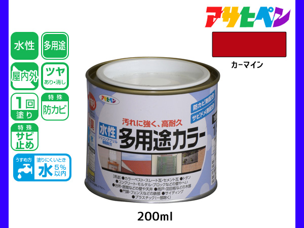 アサヒペン 水性多用途カラー 200ml (1/5L) カーマイン 塗料 ペンキ 屋内外 1回塗り 耐久性 外壁 木部 鉄部 サビ止め 防カビ 無臭
