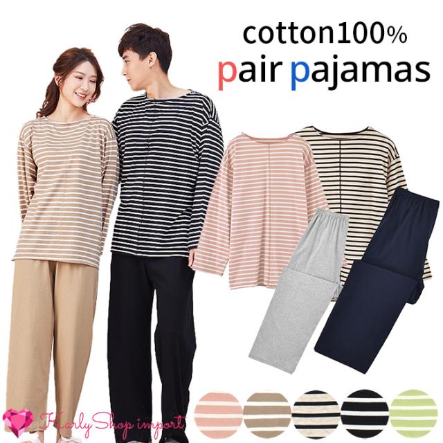 KarlyShop import パジャマ ルームウェア レディース メンズ ペア 綿100% 長袖 薄手 上下セット ボーダー おしゃれ シンプル お揃い 部屋着 pjm018