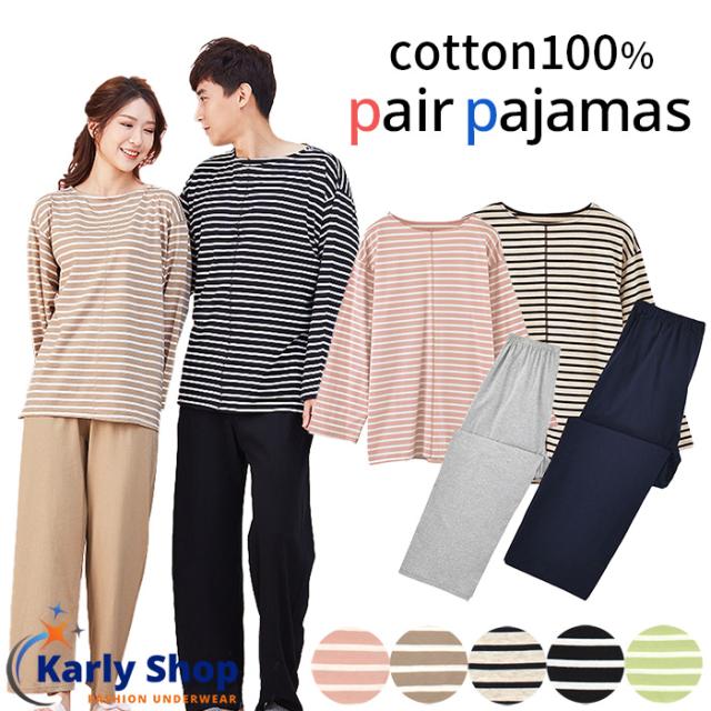 Karly Shop パジャマ ルームウェア レディース メンズ ペア 綿100% 長袖 薄手 上下セット ボーダー おしゃれ シンプル お揃い 部屋着 pjm018