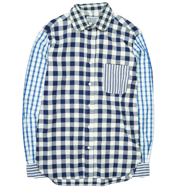 KENNETH FIELD ケネスフィールド アメリカ製 クレイジーパターン ラウンドカラーシャツ XS ネイビー 丸襟 チェック ストライプ トップス