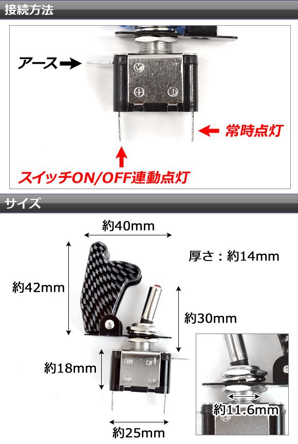 LEDの点灯は、スイッチのON/OFF連動と、常時点灯を接続方法により選択可能!