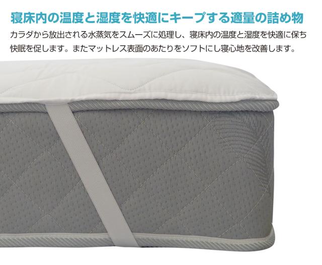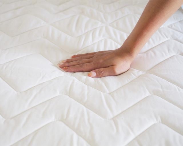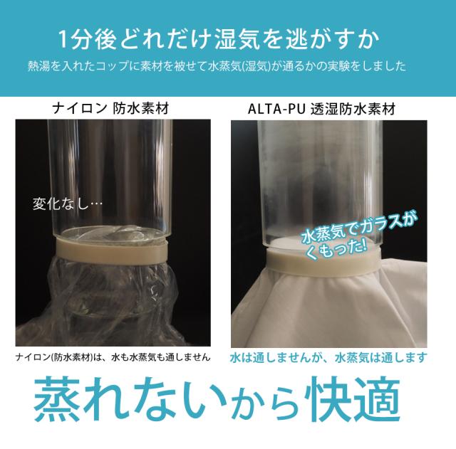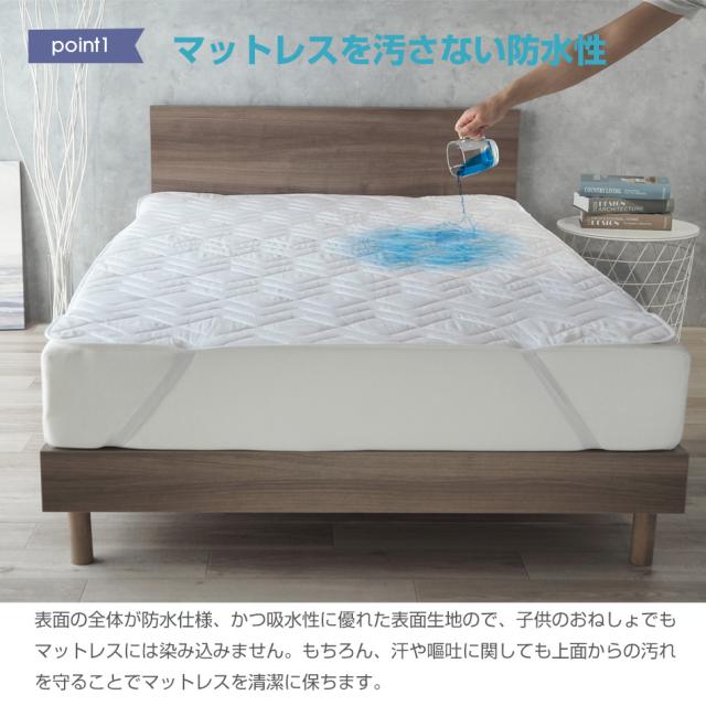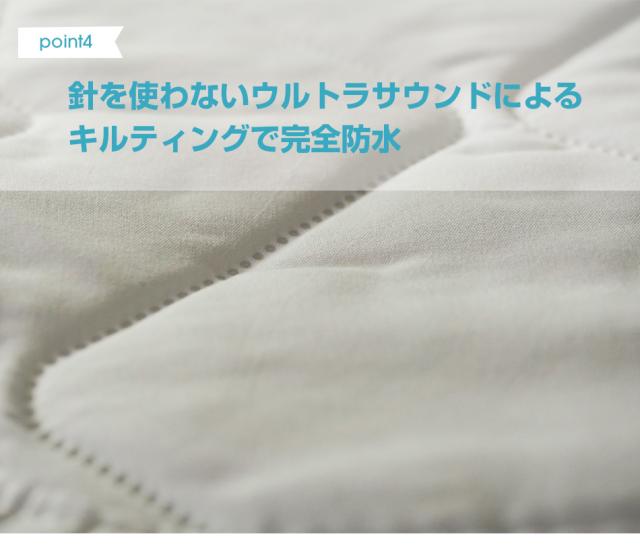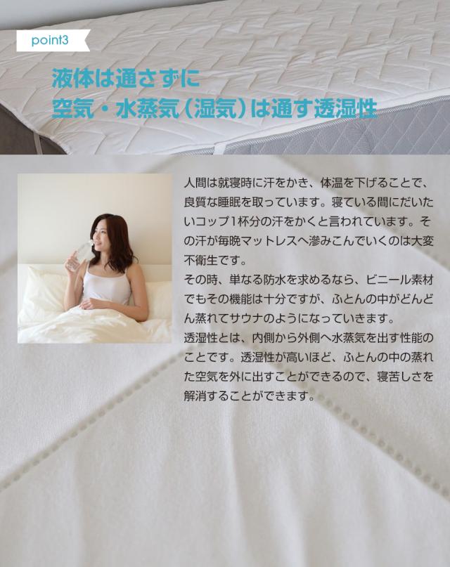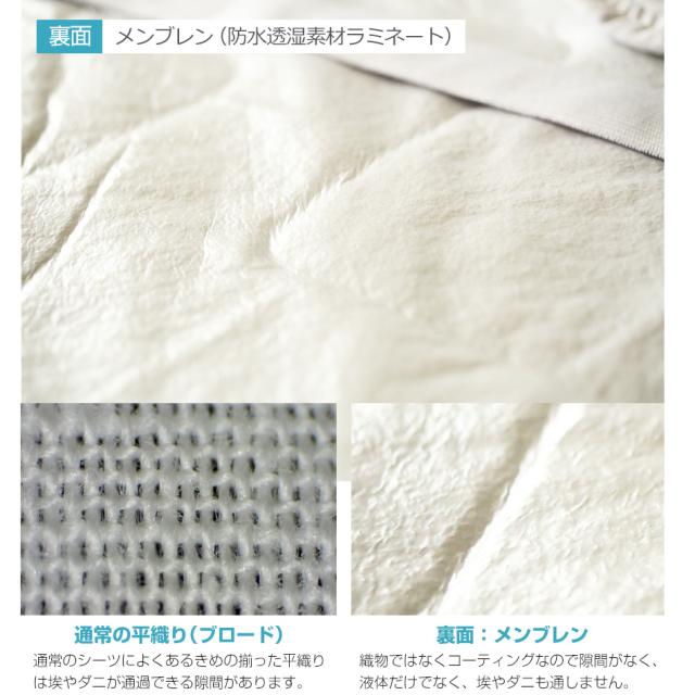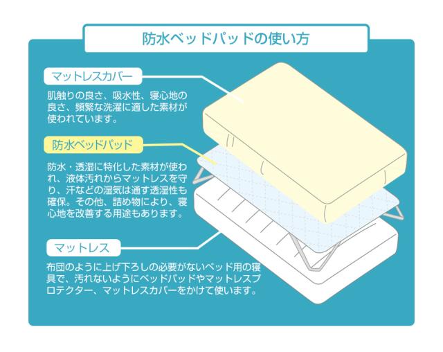 裏面にポリウレタンをコーティングしたアロエベラ入り防水ベッドパッド。水分は通さず、空気は通す、透湿性のある生地を使用し、マットレスへの浸水、汚れをしっかり防ぎます。子供との添い寝、ペットと一緒に寝ることも心配ありません。