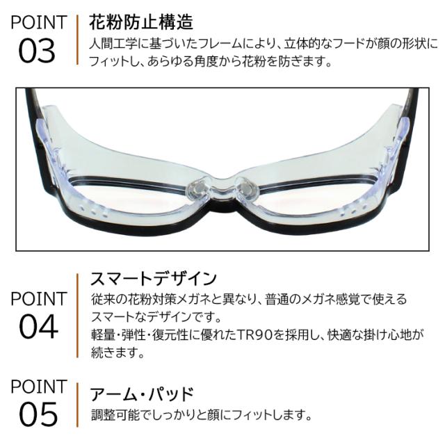 | 商品詳細 【 花粉メガネ 】kru-12 Mサイズ、kru-13 Sサイズ 生活にもっと安全を。飛沫防止・花粉・防塵対策にピッタリな機能メガネが登場。 花粉や埃をガードし、既成レンズはUVカット・くもり止め加工仕様となっています。 マスクスタイルにも取り入れやすいデザインと、普段使いしやすい4色のカラーリングで 気になる飛沫・花粉・埃対策が可能です。 Mサイズ(メンズ向け)とSサイズ(レディース向け)の2サイズをご用意。 POINT1 保護フード付きで、安全対策。 保護フードは着脱可能です。 フードを外して、伊達メガネとしてお使いいただくことができます。 POINT2 曇りにくいレンズ 透明性・耐衝撃性・耐熱性に優れた光学レンズを採用し、そのレンズに「特殊防曇コート」を施すことにより、視界をクリアにします。 POINT3 花粉防止構造 人間工学に基づいたフレームにより、日台的なフードが顔にフィットし、あらゆる角度から花粉を防ぎます。 POINT4 スマートデザイン 従来の花粉対策メガネと異なり、普通のメガネ感覚で使えるスマートなデザインです。 軽量・弾性・復元性に優れたTR90を採用し、快適な掛け心地が続きます。 POINT5 アーム・パッド 鼻パッドと耳にかかるモダン部分は調整可能ですので、お顔の形に合わせて調整でき、しっかりと顔にフィットします。 (中国製) | |