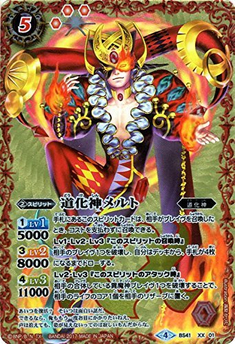 ★バトルスピリッツ「煌臨編 第2章 蒼キ海賊」(BS41)収録 ■カード名:道化神メルト ■レアリティ:XXレア ■種類:スピリット ■コスト:5/軽減シンボル:3/赤/動器・戦騎・武装 ■Lvコスト:(1)Lv1 5000(2)Lv2 10000 手札にあるこのスピリットカードは、相手がブレイヴを召喚したとき、コストを支払わずに召喚できる。 ◆Lv1・Lv2・Lv3『このスピリットの召喚時』 相手のブレイヴ1つを破壊し、自分はデッキから、手札が4枚になるまでドローする。 ◆Lv2・Lv3『このスピリットのアタック時』 相手の合体している異魔神ブレイヴ1つを破壊することで、相手のライフのコア1個を相手のリザーブに置く。 ■シンボル:赤