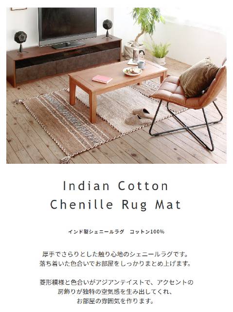 ラグ ラグマット センターラグ アクセントラグ 綿 コットン インド綿 インド製シェニールラグ 菱形ストライプ 130x90