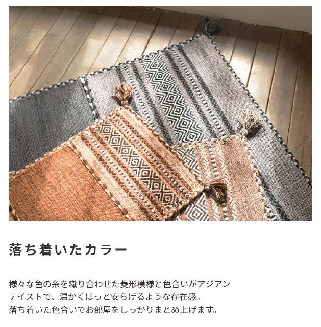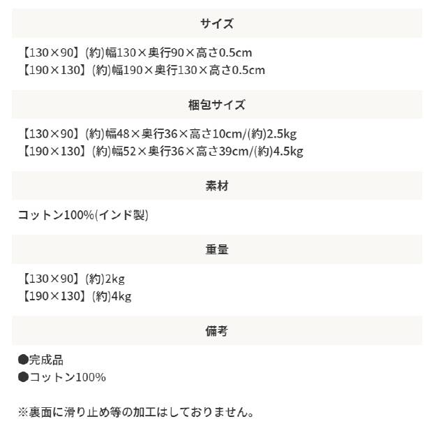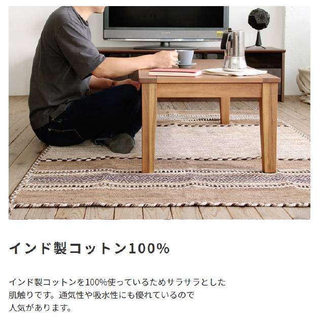 インド製のコットンを100%使っており、素足で過ごしたくなる踏み心地が魅力です。