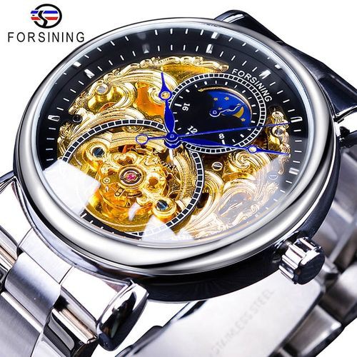 Forsining自動機械式ビジネスウォッチメンズ時計ゴールデンムーンフェイズスチールストラップ腕時計 S1125-7