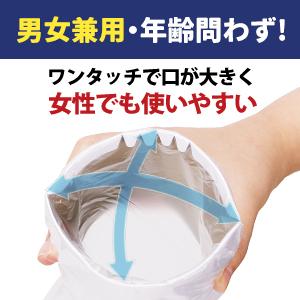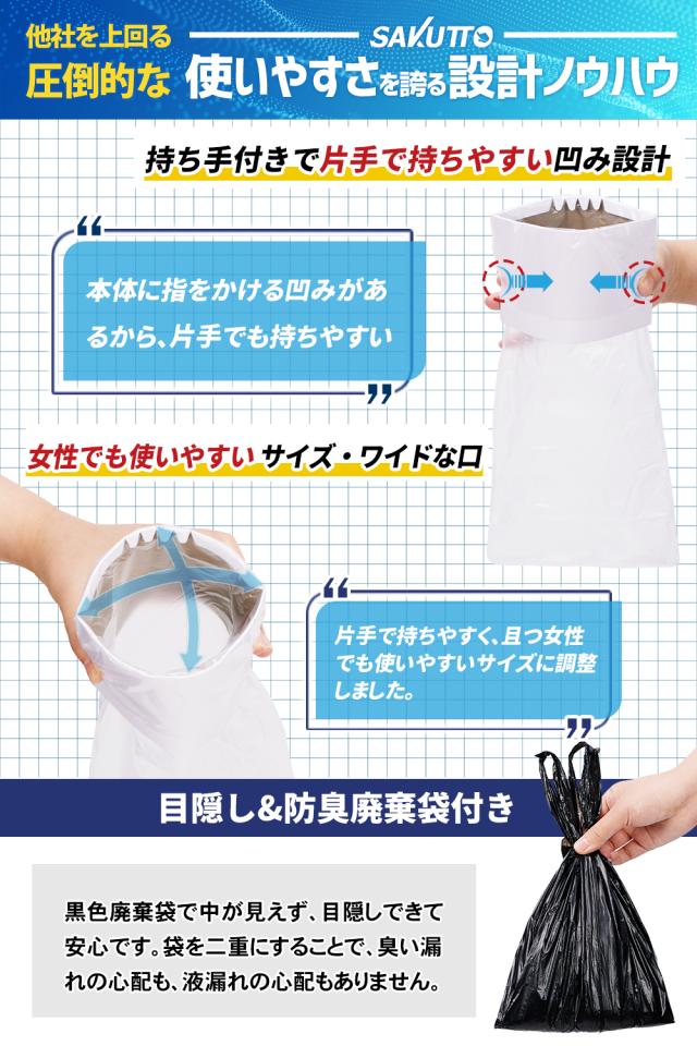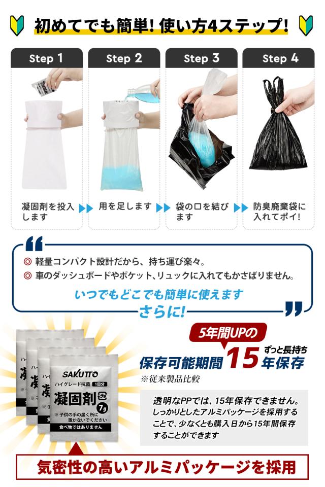 いつでもどんな場所でもすぐに使用できる事を1番に考え、水が不要で、便座も不要、抗菌剤入り凝固剤と二重処理の防臭廃棄袋付きで消臭・防臭効果に優れ、あらゆるシーンに携帯できるように開発されました。