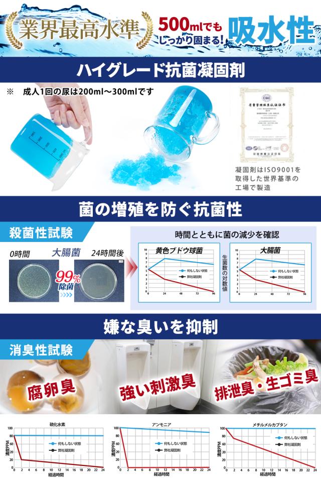 A : 液体に反応して、瞬時に固まり跳ね返りを抑え抗菌剤入りの為、抗菌・消臭効果があります。