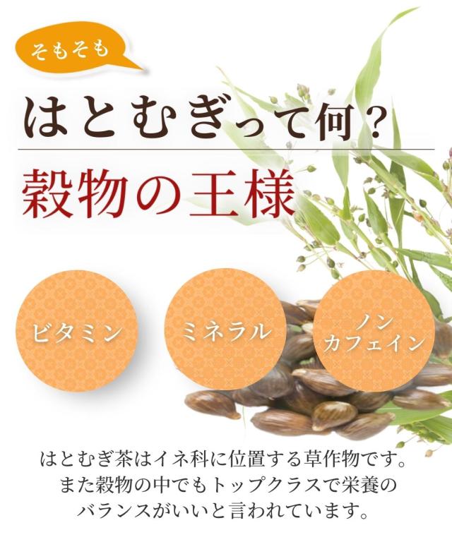 国産の高品質なはとむぎを100%使用。ヨクイニン(皮を除いた種子の部分)でよく知られるはとむぎですが、実は殻・皮も栄養豊富。穀物の王様といわれるはとむぎを丸ごとお茶にしました。