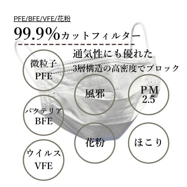 ●三層の不織布構造で保湿にも通気性にも優れ、ウイルス飛沫、ほこり、花粉等のミクロ粒子をブロック!