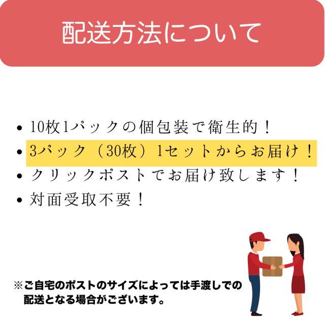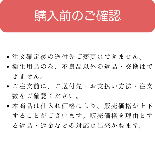 | 商品について | ※ディスプレイ画面等の環境上、写真と実際の商品の色とは多少異なる場合がございます。 ※当店で購入したマスクを転売すると、処罰対象となる可能性があります。 ※衛生用品のため、お届け後の返品交換は不可とさせていただきます。 |