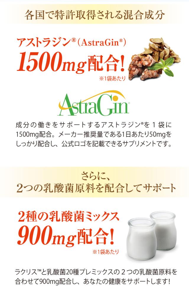 1粒であなたの毎日を加速させる!アストラジンとラクリス、乳酸菌種20プレミックスの二つの乳酸菌原料を配合したサプリメント。