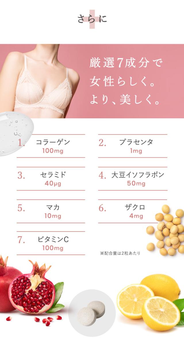 | 成分 | 還元麦芽糖水飴(国内製造)、豚コラーゲンペプチド、エラスチンペプチド(魚由来)、大豆抽出物、ザクロ果皮エキス末、有機マカ粉末、豚プラセンタエキス末、パイナップル果実抽出物/V.C、セルロース、ステアリン酸カルシウム、微粒酸化ケイ素、シクロデキストリン、(一部にゼラチン・大豆・豚肉を含む) |