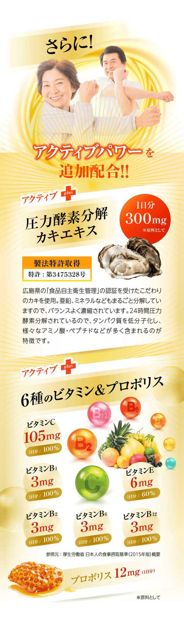 製法特許取得の圧力酵素分解カキエキス、6種類のビタミン、プロポリスとアクティブパワーを贅沢配合!