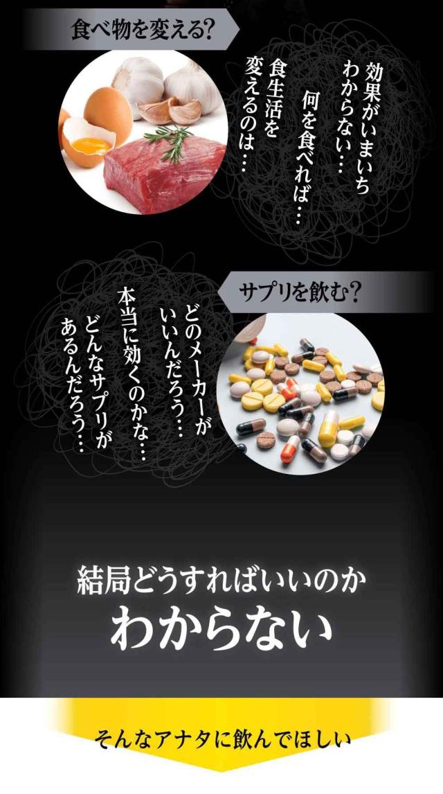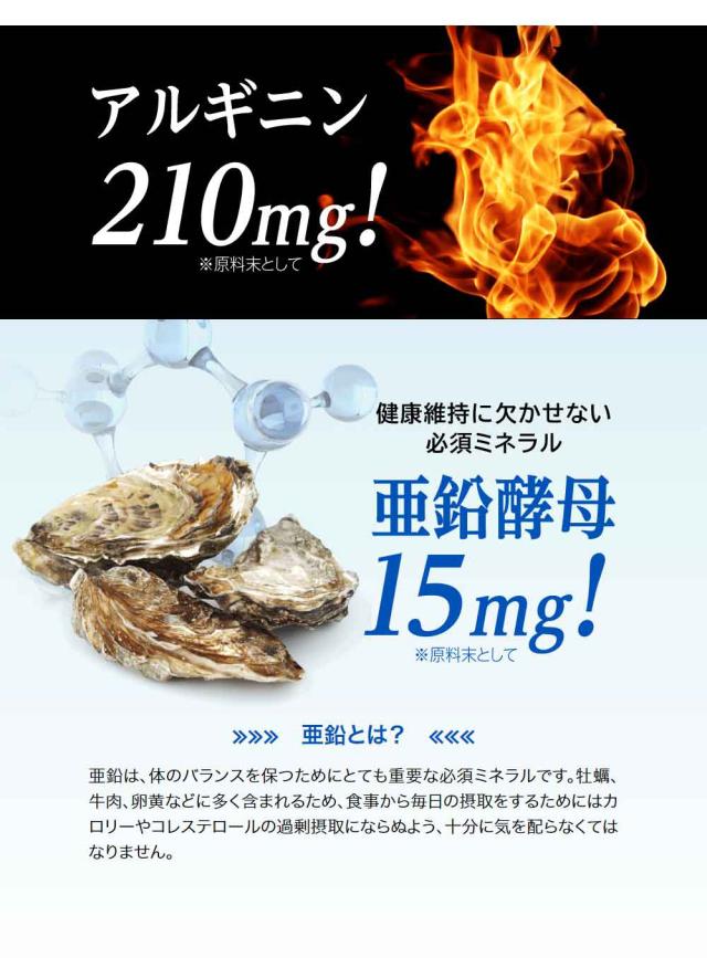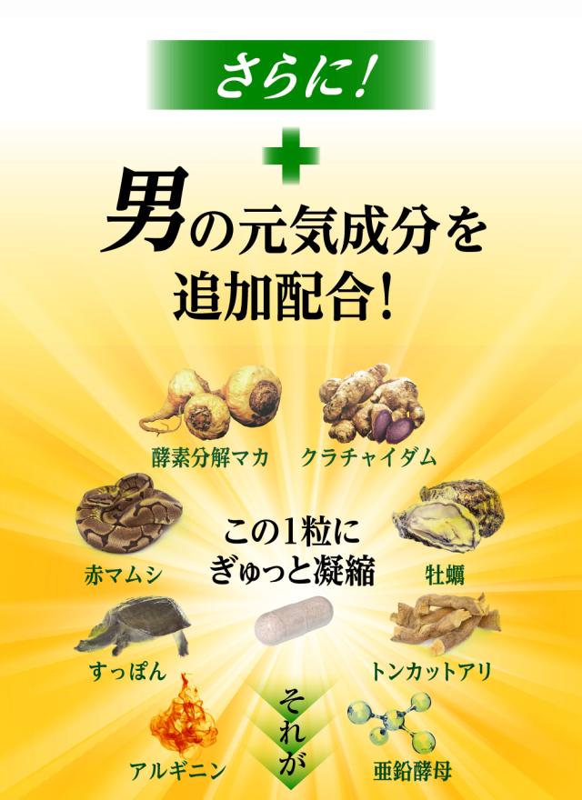 | 原材料名 | 酵素分解マカ末(酵素分解マカ、難消化性デキストリン)、デンプン、ブラックジンジャーエキス末(ブラックジンジャーエキス、デキストリン)、ビール酵母、スッポン末、赤マムシ末、亜鉛含有酵母、牡蠣エキス末、トンカットアリエキス末/L-アルギニン、ヒドロキシプロピルメチルセルロース、シクロデキストリン、ステアリン酸カルシウム、微粒二酸化ケイ素、カラメル色素 |