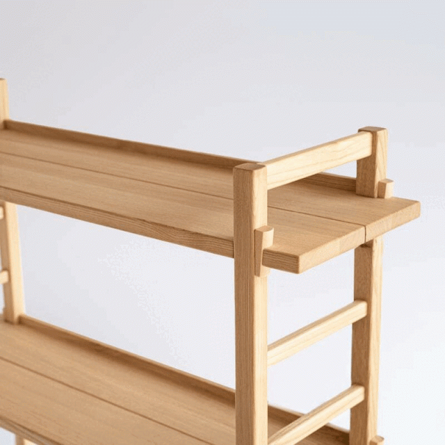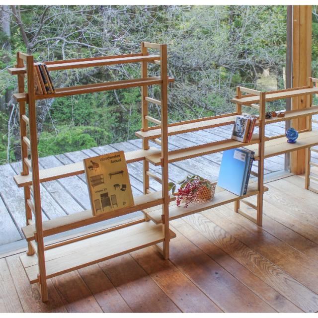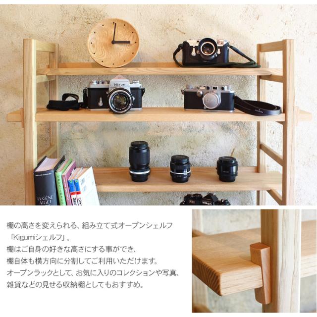 商品説明:棚の高さを変えられる、組み立て式オープンシェルフ「Kigumiシェルフ」。